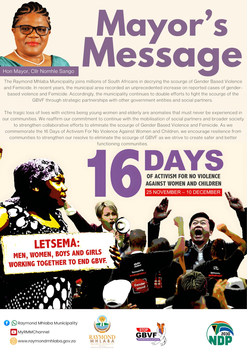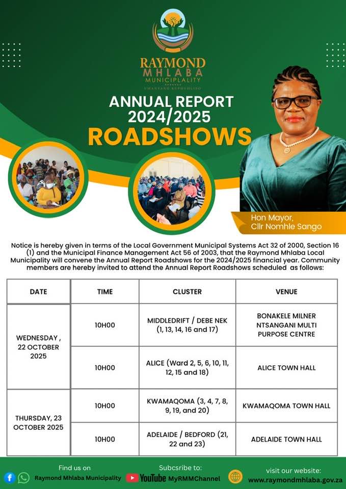 Notice is hereby given in terms of the Local Government Systems Act 32 of 2000, Section 16 (1) and the Municipal Finance Management Act 56 of 2003, that the Raymond Mhlaba Local Municipality will convene the Annual Report Roadshows for the 2024/2025 Financial year. Community members are hereby invited to attend the Annual Report Roadshows as scheduled.