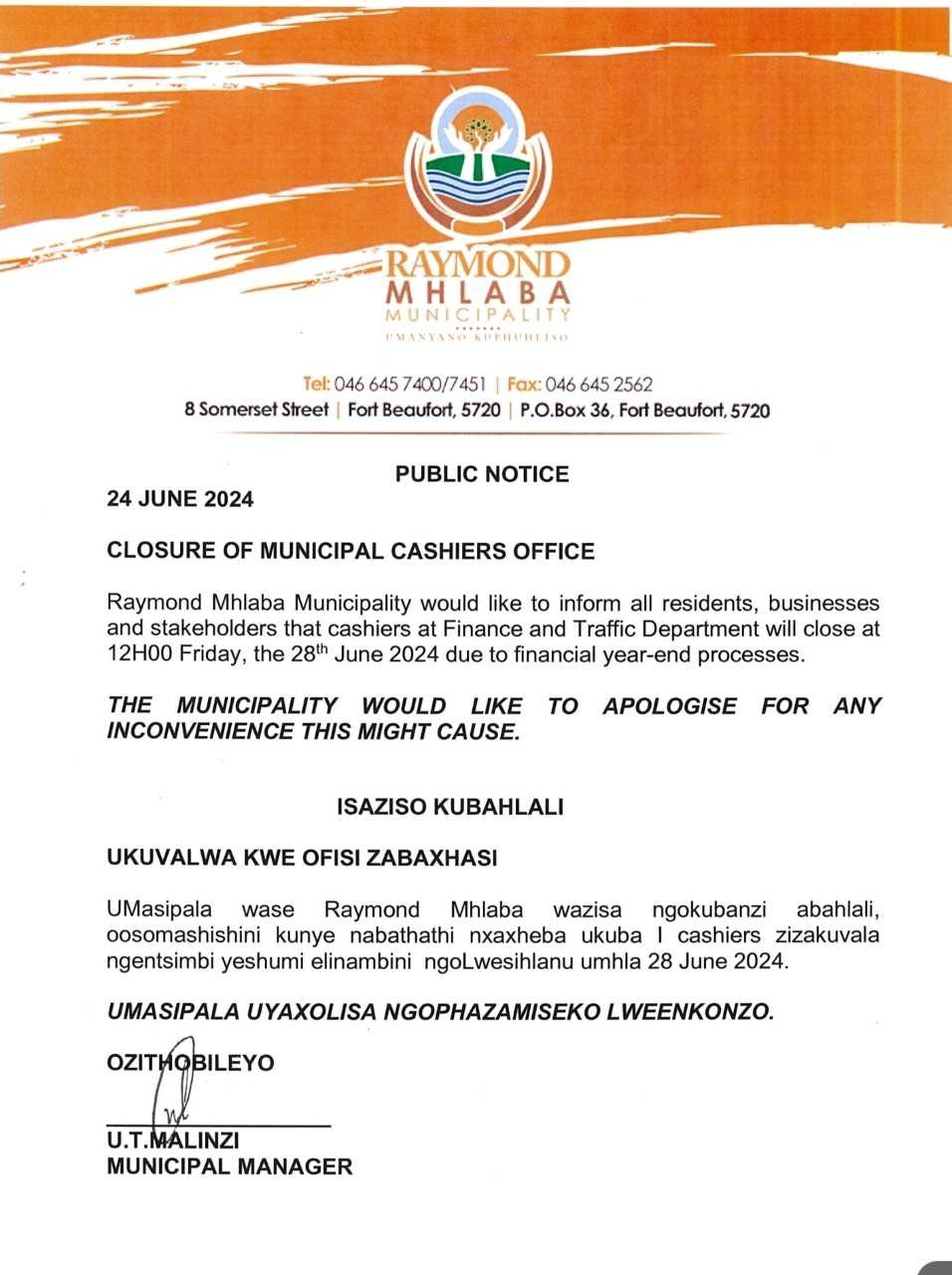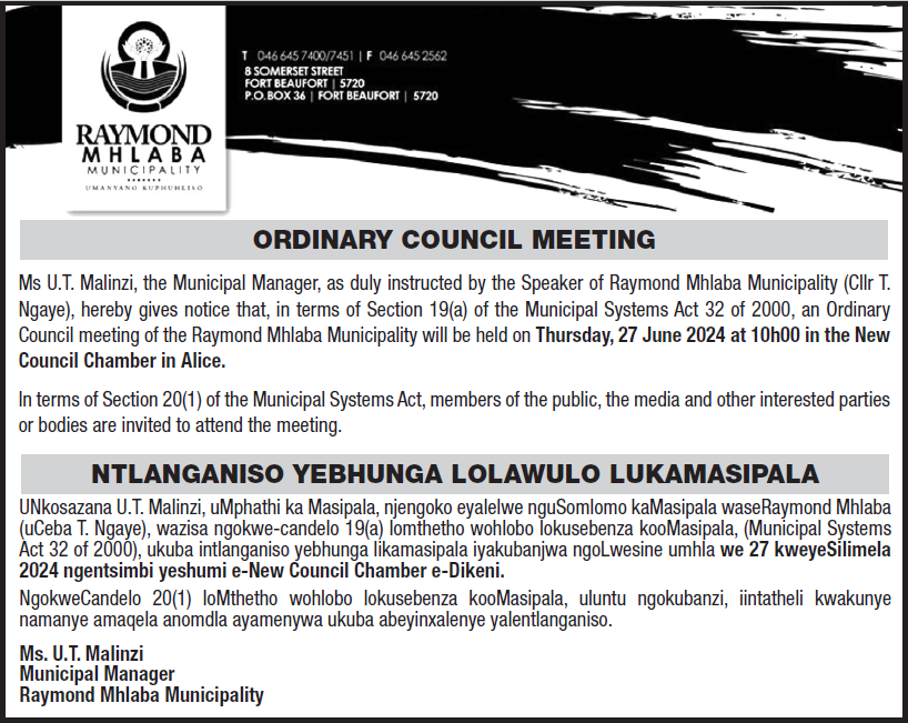 Council meeting of the Raymond Mhlaba Municipality will be held on Tuesday, 22 September 2024 at 10h00