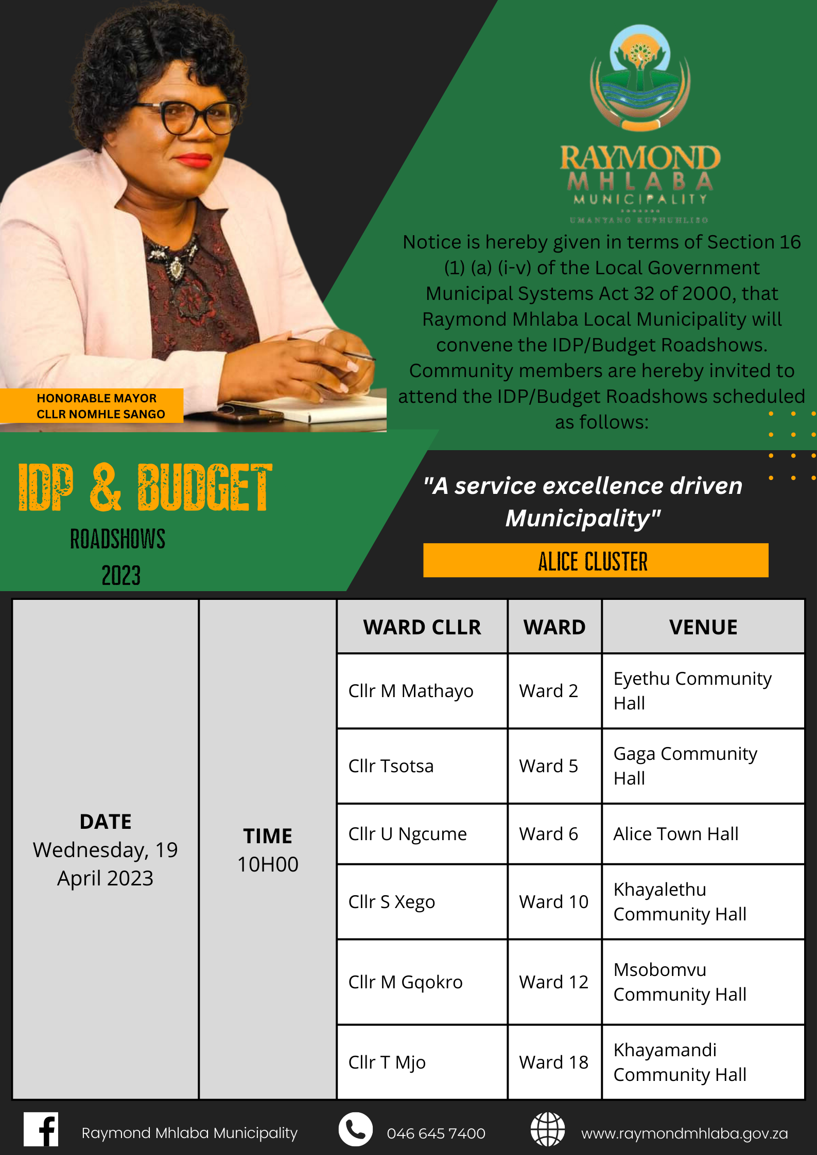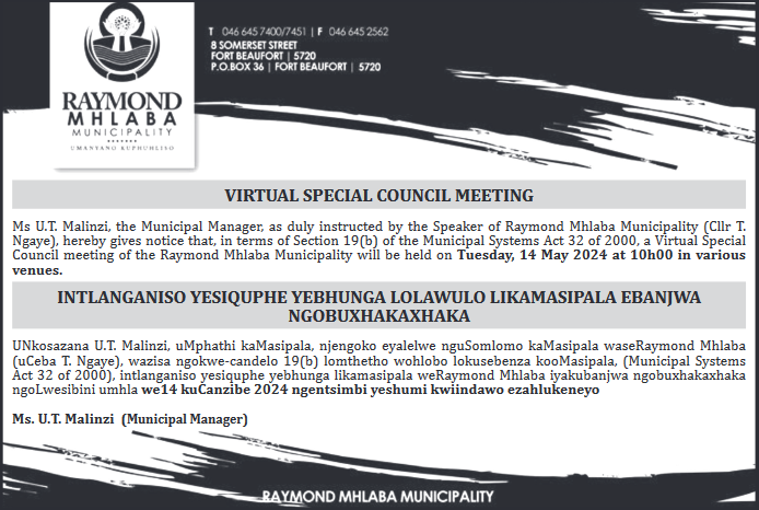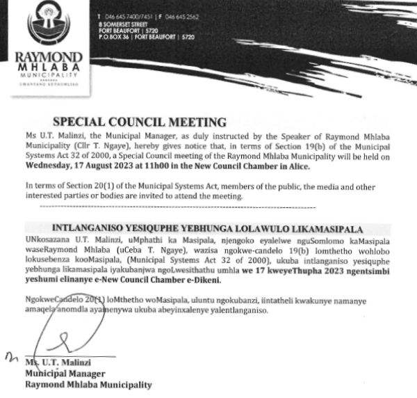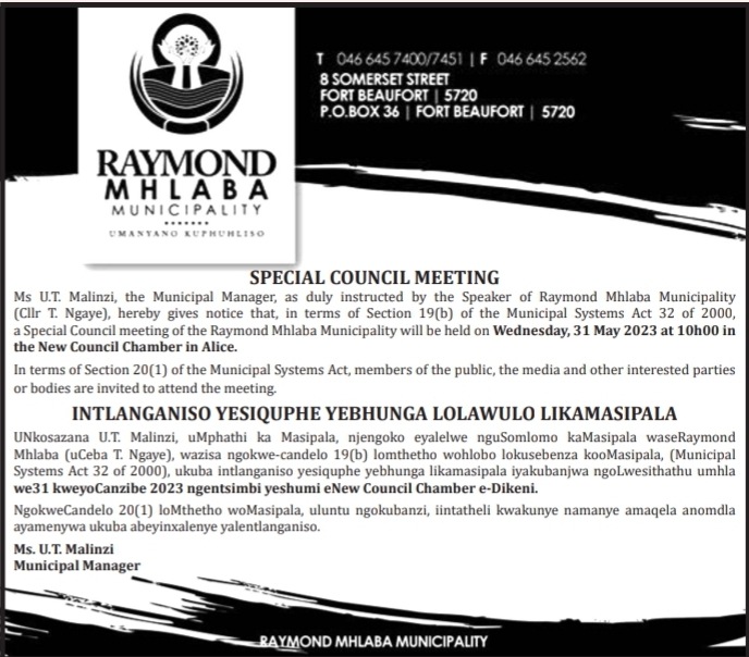 Ms U.T. Malinzi, the Municipal Manager, as duly instructed by the Speaker of Raymond Mhlaba Municipality (Cllr T. Ngaye), hereby gives notice that, in terms of Section 19(b) of the Municipal Systems Act 32 of 2000, a Special Council meeting of the Raymond Mhlaba Municipality will be held on Wednesday, 17 August 2023 at 11h00 in the Council Chamber in Alice.