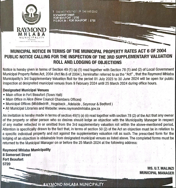 Council meeting of the Raymond Mhlaba Municipality will be held on Tuesday, 14 May 2024 at 10h00 in various