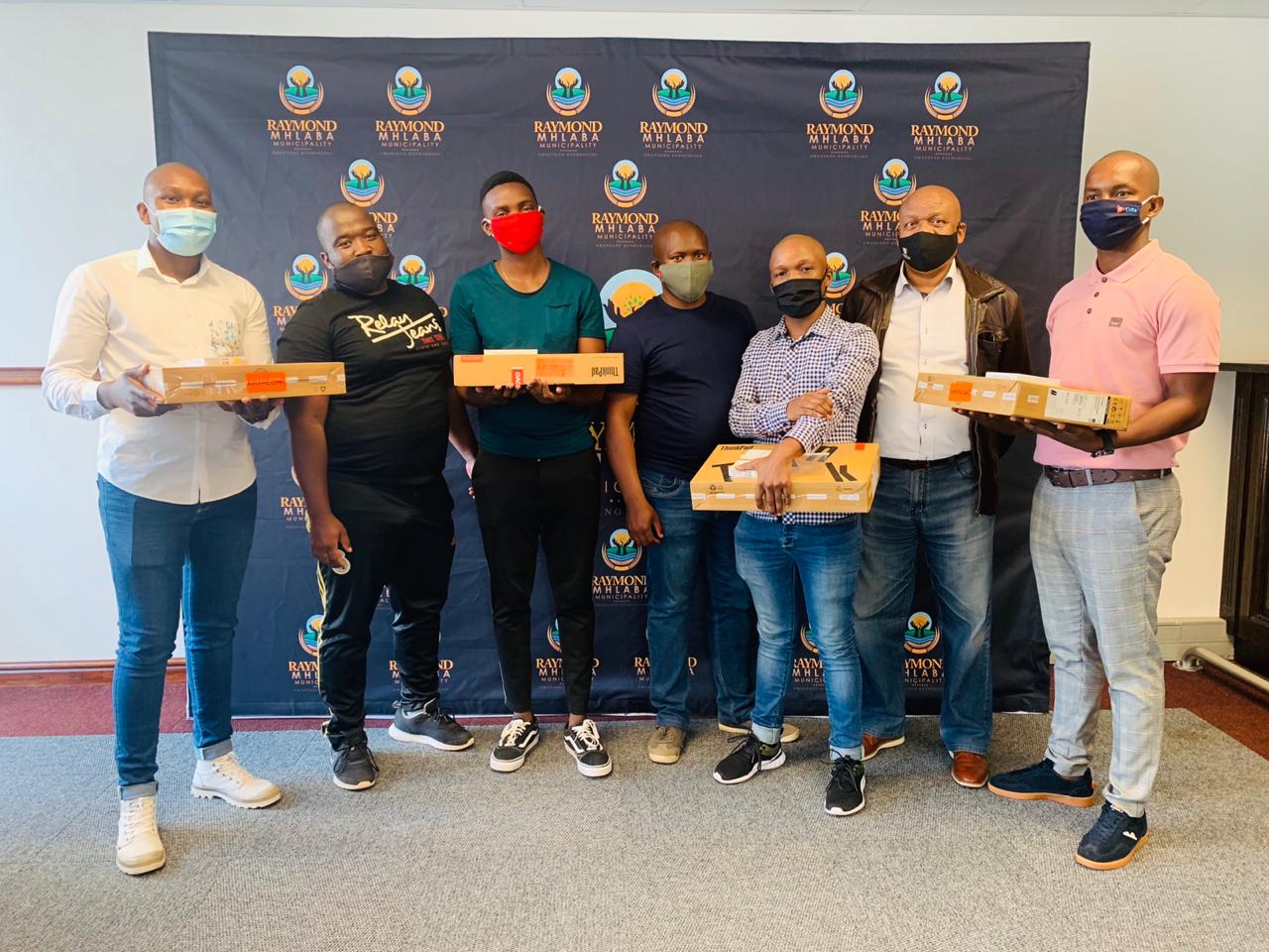 Honorable Mayor Cllr Bandile Ketelo handing over laptops to four medical students in Alice