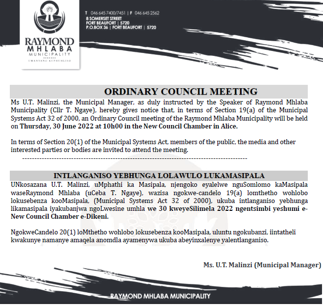 Ms U.T. Malinzi, the Municipal Manager, as duly instructed by the Speaker of Raymond Mhlaba Municipality (Cllr T. Ngaye), hereby gives notice that, in terms of Section 19(a) of the Municipal Systems Act 32 of 2000, an Ordinary Council meeting of the Raymond Mhlaba Municipality will be held on Thursday, 30 June 2022 at 10h00 in the New Council Chamber in Alice.
